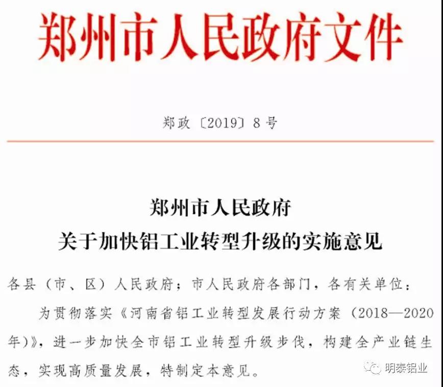 2019年3月18日,為貫徹落實(shí)《河南省鋁工業(yè)轉(zhuǎn)型發(fā)展行動(dòng)方案(2018—2020年)》,鄭州市人民政府印發(fā)了《鄭州市人民政府關(guān)于加快鋁工業(yè)轉(zhuǎn)型升級(jí)的實(shí)施意見》(以下簡稱《意見》),《意見》對(duì)全市鋁工業(yè)發(fā)展進(jìn)行了明確的要求和全面的部署。明泰鋁業(yè)近年來加快了轉(zhuǎn)型升級(jí)、綠色化改造、創(chuàng)新發(fā)展及智能化改造的步伐,與鄭州市政府對(duì)鋁加工行業(yè)的要求和部署不謀而合。