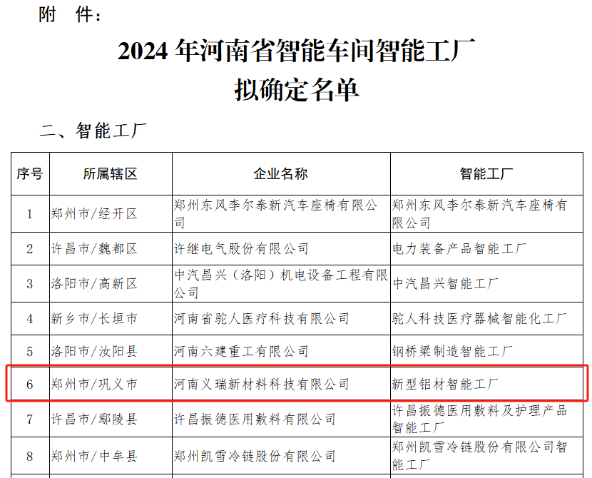 根據(jù)《河南省加快數(shù)字化轉(zhuǎn)型推動制造業(yè)高端化智能化綠色化發(fā)展行動計劃(2023—2025年)》(豫政〔2023〕32號)、《河南省制造強(qiáng)省建設(shè)領(lǐng)導(dǎo)小組辦公室關(guān)于印發(fā)2024年河南省加快數(shù)字化轉(zhuǎn)型推動制造業(yè)高端化智能化綠色化發(fā)展工作方案的通知》(豫制造強(qiáng)省辦〔2024〕13號)、《河南省工業(yè)和信息化廳辦公室關(guān)于開展2024年制造業(yè)數(shù)字化轉(zhuǎn)型示范遴選工作的通知》(豫工信辦〔2024〕30號)等文件要求,經(jīng)主管部門審核,明泰鋁業(yè)下屬子公司河南義瑞新材料科技有限公司新型鋁材智能工廠被評為“2024年河南省智能工廠”。